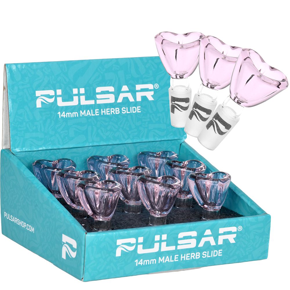 With a 9-count display, this herb slide is perfect for sharing or restocking your collection. Indulge in your playful side and elevate your smoking experience with the Pulsar Heart-Shaped Bowl Herb Slide!
